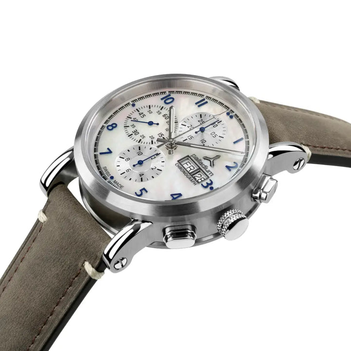 Der Palladium Nacre Chrono P40.A.1.1.008 ist ein Meisterstück moderner Schweizer Uhrmacherkunst. Er kombiniert ein selten schönes Zifferblatt aus echtem Perlmutt mit dem legendären ETA-7750 Chronographenwerk und einem fein komponierten dreiteiligen Edelstahlgehäuse. Das Ergebnis ist ein Zeitmesser, der gleichzeitig technisch beeindruckt und optisch höchsten Ansprüchen genügt.