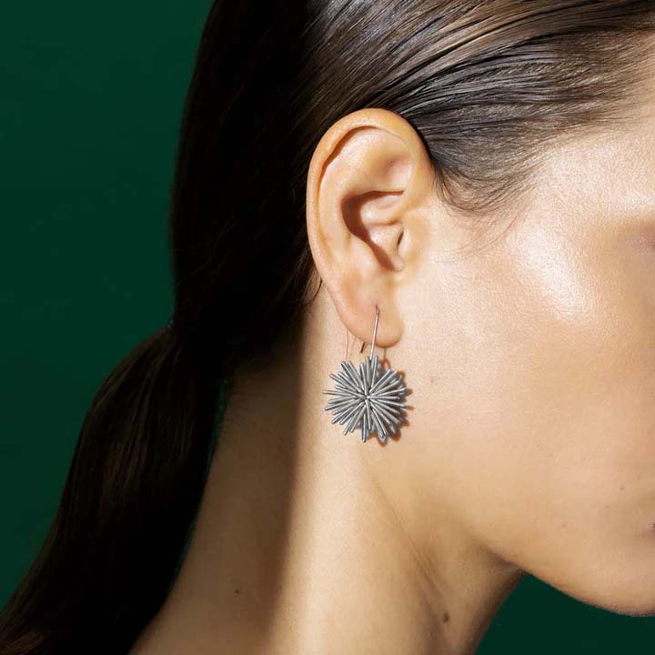 Mehrere identische Spiralmodule werden radial angeordnet und fixiert. Dadurch entsteht eine gleichmässige Geometrie mit klarer Kante und fein gestreuter Reflexion. Die Ohrhaken sind so gebogen, dass das Gewicht nah am Ohr sitzt und der Hänger ruhig auspendelt.
