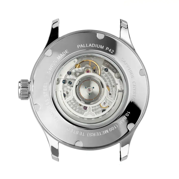 Im Inneren der Palladium Nacre P42.A.1.1.001 arbeitet ein dekoriertes Sellita SW300, ein bewährtes Schweizer Automatikwerk, das für Zuverlässigkeit und Präzision steht. Das Kaliber bietet eine Gangreserve von rund 50 Stunden, was im Alltag bedeutet, dass die Uhr auch nach einer Tragepause von ein bis zwei Tagen zuverlässig weiterläuft. Die Automatikmechanik gewinnt ihre Energie aus der Bewegung des Handgelenks – eine Batterie ist nicht nötig. Auf Wunsch kann das Werk zusätzlich von Hand über die Krone aufgezogen werden, was das Gefühl klassischer Uhrmacherkunst nochmals verstärkt.
