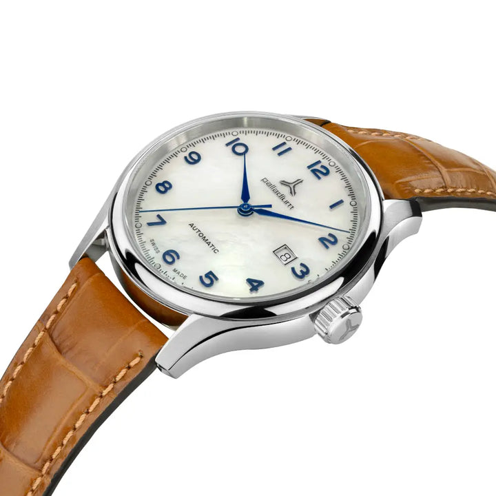 Die Palladium Nacre P42.A.1.1.001 ist eine Swiss Made Unisex Automatikuhr, die dezente Eleganz mit echter Uhrmacherkunst verbindet. Ihr Zifferblatt aus echtem Perlmutt in Weiss sorgt für ein lebendiges Farbspiel, das je nach Lichteinfall schimmert, bricht und reflektiert. Jede Scheibe Perlmutt ist ein Unikat – damit wird auch jede Nacre zu einem Einzelstück mit eigener Persönlichkeit. Diese Uhr ist bewusst als Unisex Modell für Damen und Herren gestaltet und trägt sich sowohl an schmaleren wie auch an markanteren Handgelenken sehr harmonisch.