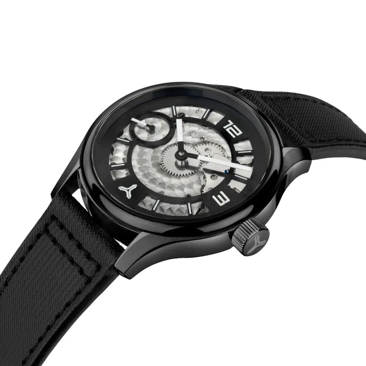 Die DLC-Beschichtung (Diamond-Like Carbon) bietet nicht nur eine edle Optik, sondern auch hervorragende Kratzresistenz und hohe Oberflächenhärte. In Kombination mit der offenen Mechanik entsteht ein Zeitmesser, der sowohl robust als auch ästhetisch überdurchschnittlich wirkt.